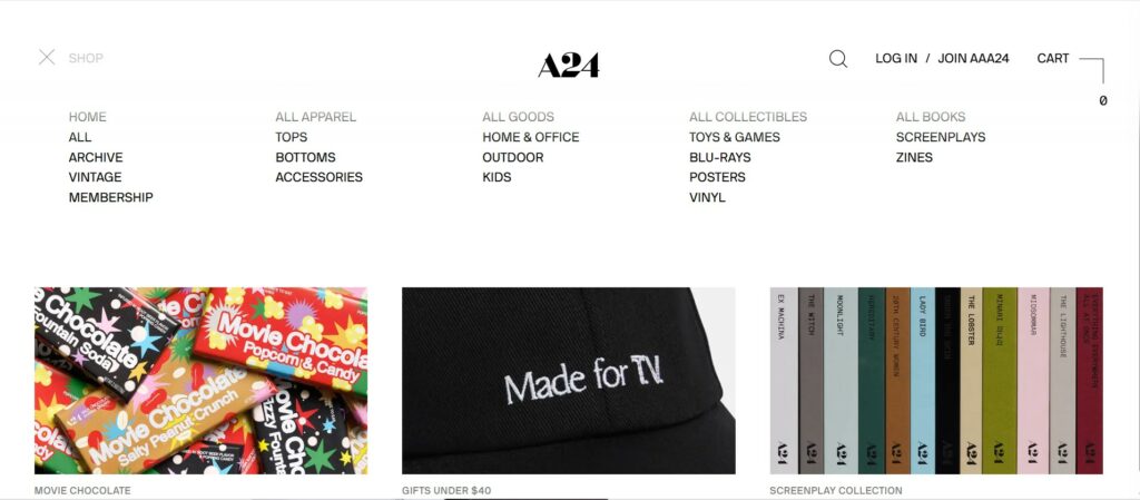 Le studio est également célèbre pour ses produits dérivés. En effet, il a lancé sa propre boutique en ligne, proposant tout un tas de goodies à l’effigie de l’entreprise, allant des casquettes aux t-shirts, en passant par les tote-bags et même les caleçons. Mais ce merchandising ne s’arrête pas là, puisqu’A24 sort régulièrement des goodies de ses films : des gants main hot-dog et des packs d’yeux globuleux pour «Everything eveywhere all at once», des stickers et des mini temples jaunes pour l’encens pour «Midsommar», des pyjamas pour «Beau is afraid», du maquillage, des pendentifs et des rubans pour adopter le style de Priscilla Presley pour «Priscilla»,… Les exemples sont légions. Il est à noter que le studio s’est inspiré des grandes marques de mode dans son marketing : ces goodies sont en durée limitée et distribués lors de «drop out», ce qui crée un événement autour du film et un esprit de rareté dans les produits qui attire les consommateurs. Pour en faire la publicité, A24 possède un site internet officiel consacré notamment à ces produits et goodies et sur lequel la marque communique ces exclusivités et leurs actualités au moyen d’une newsletter. En outre, un moyen très astucieux pour le studio de faire d’importants bénéfices, tout en promouvant leurs films.